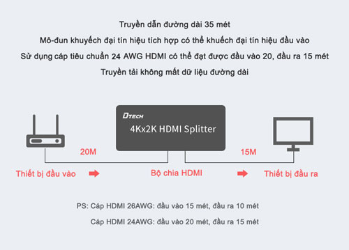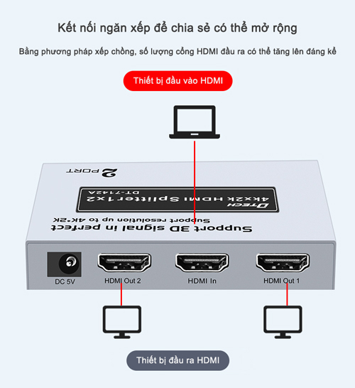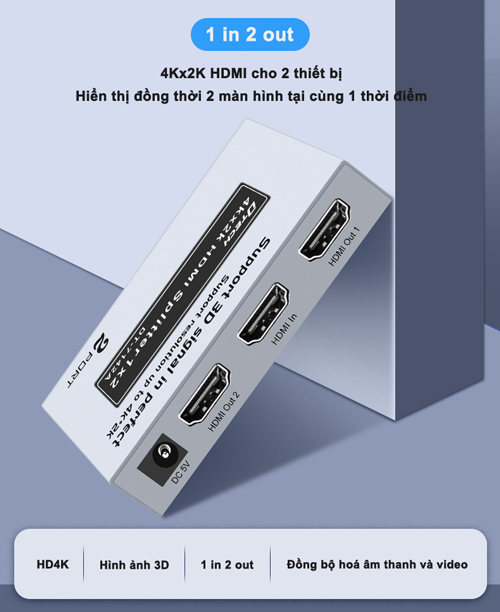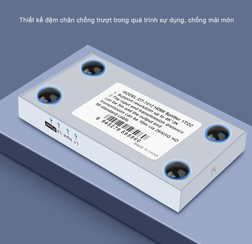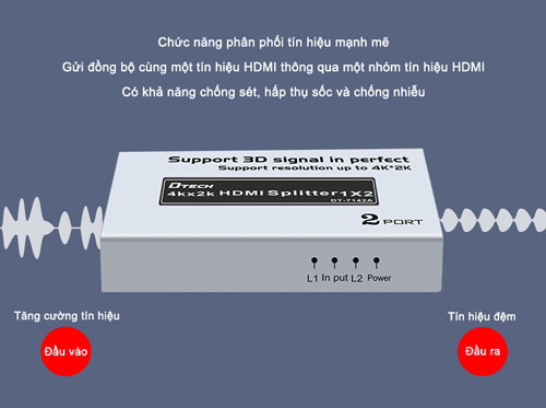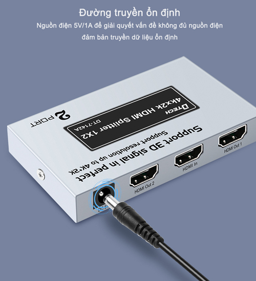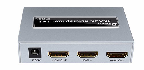Bộ chia HDMI 2 cổng hỗ trợ trình chiếu 4K*2K, DT-7142 hỗ trợ 1 cổng vào tín hiệu HDMI và cho phép mở rộng, xuất tín hiệu ra 2 cổng đồng thời cùng lúc mà không hề bị suy hao tín hiệu